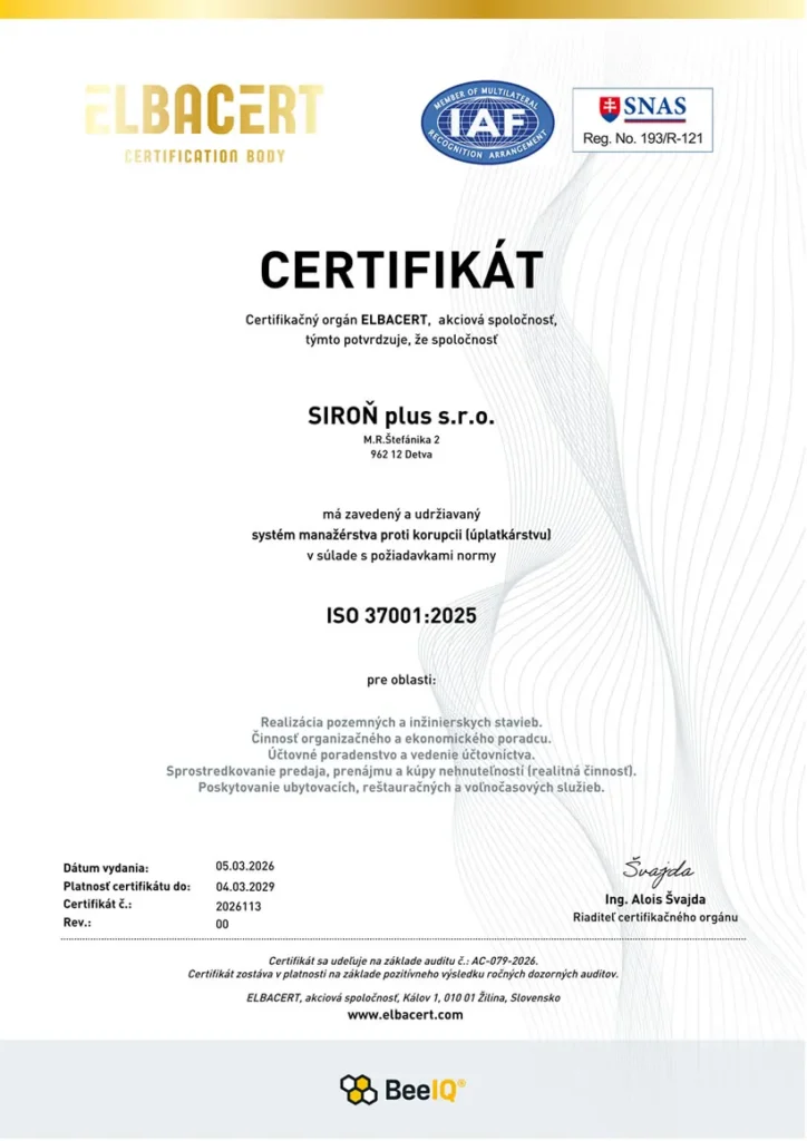 Spoločnosť má zavedený a certifikovaný systém riadenia kvality podľa normy ISO 9001: 2015 s aplikáciou požiadaviek ISO 10006:2017 , systém environmentálneho manažérstva podľa normy ISO 14001: 2015, systém bezpečnosti a ochrany zdravia pri práci podľa normy ISO 45001: 2018.